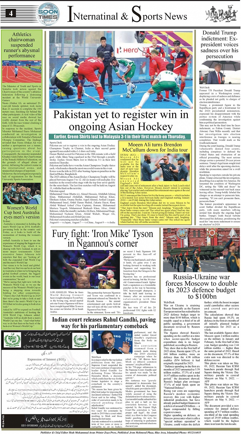 Daily Soon Times Page: 4 August 05, 2023 Daily Soon Times Today's ePaper Leading English Newspaper from Islamabad, Sargodha, Karachi << First << 4 >> Last >> Page 1Page 2Page 3Page 4 × Daily Soon Times 1234 1234 4