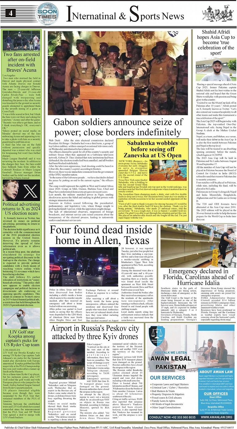 Daily Soon Times Page: 4 August 31, 2023 Daily Soon Times Today's ePaper Leading English Newspaper from Islamabad, Sargodha, Karachi << First << 4 >> Last >> Page 1Page 2Page 3Page 4 × Daily Soon Times 1234 1234 4