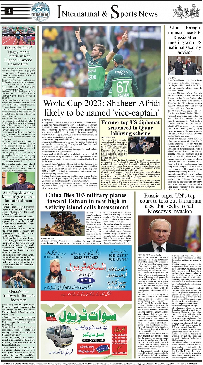 Daily Soon Times Page: 4 September 19, 2023 Daily Soon Times Today's ePaper Leading English Newspaper from Islamabad, Sargodha, Karachi << First << 4 >> Last >> Page 1Page 2Page 3Page 4 × Daily Soon Times 1234 1234 4