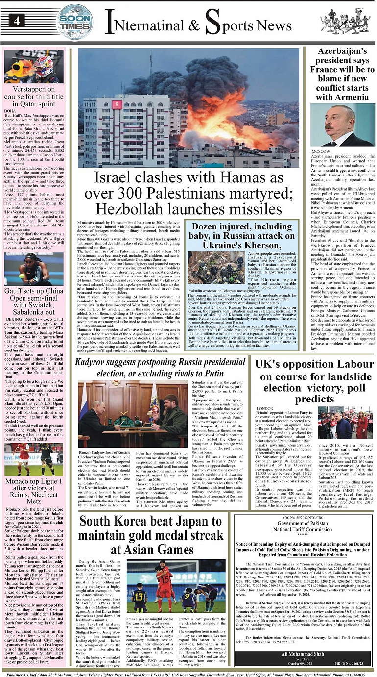 Daily Soon Times Page: 4 October 09, 2023 Daily Soon Times Today's ePaper Leading English Newspaper from Islamabad, Sargodha, Karachi << First << 4 >> Last >> Page 1Page 2Page 3Page 4 × Daily Soon Times 1234 1234 4