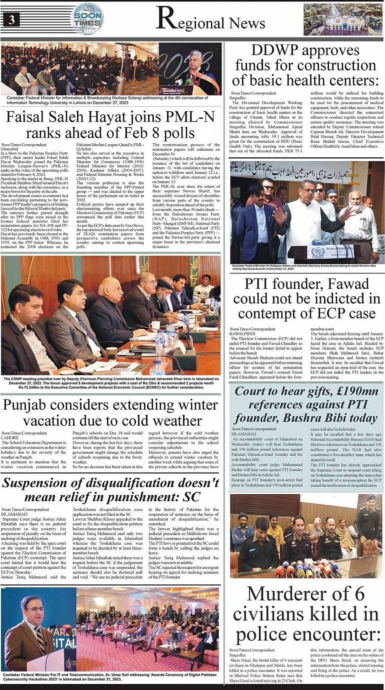 Daily Soon Times Page: 3 December 28, 2023 Daily Soon Times Today's ePaper Leading English Newspaper from Islamabad, Sargodha, Karachi << First << 3 >> Last >> Page 1Page 2Page 3Page 4 × Daily Soon Times 1234 1234 3