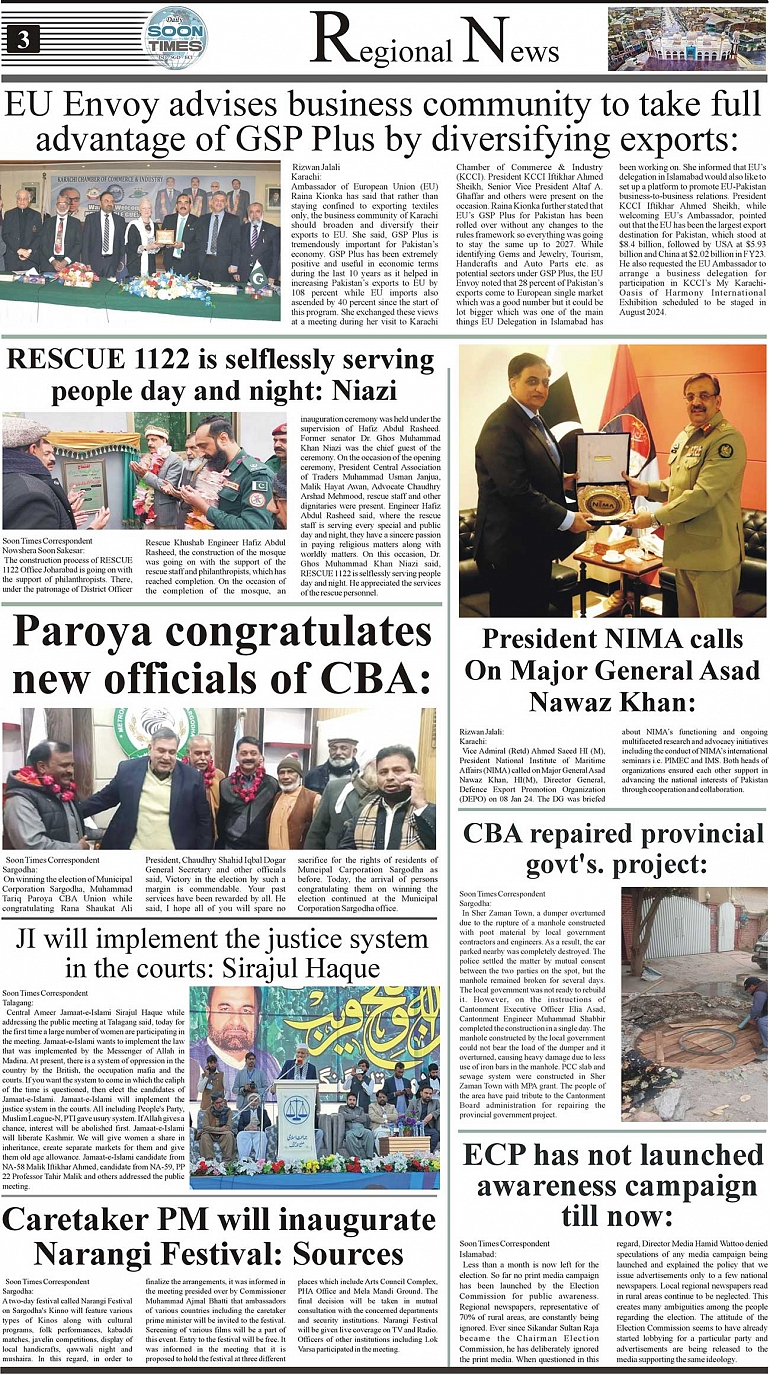 Daily Soon Times Page: 3 January 10, 2024 Daily Soon Times Today's ePaper Leading English Newspaper from Islamabad, Sargodha, Karachi << First << 3 >> Last >> Page 1Page 2Page 3Page 4 × Daily Soon Times 1234 1234 3