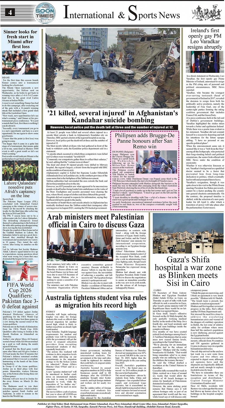 Daily Soon Times Page: 4 March 22, 2024 Daily Soon Times Today's ePaper Leading English Newspaper from Islamabad, Sargodha, Karachi << First << 4 >> Last >> Page 1Page 2Page 3Page 4 × Daily Soon Times 1234 1234 4