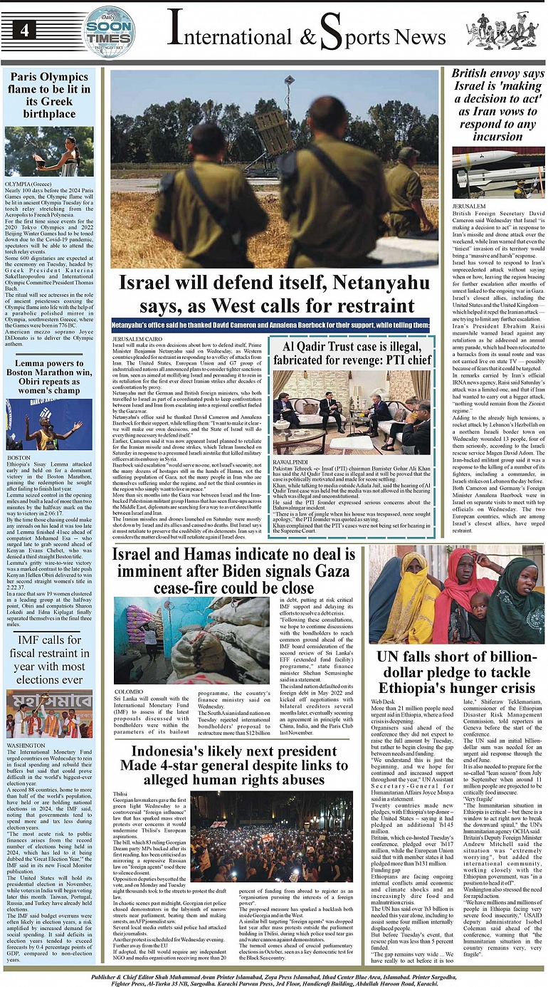 Daily Soon Times Page: 4 April 18, 2024 Daily Soon Times Today’s ePaper Leading English Newspaper from Islamabad, Sargodha, Karachi << First << 4 >> Last >> Page 1Page 2Page 3Page 4 × Daily Soon Times 1234 1234 4