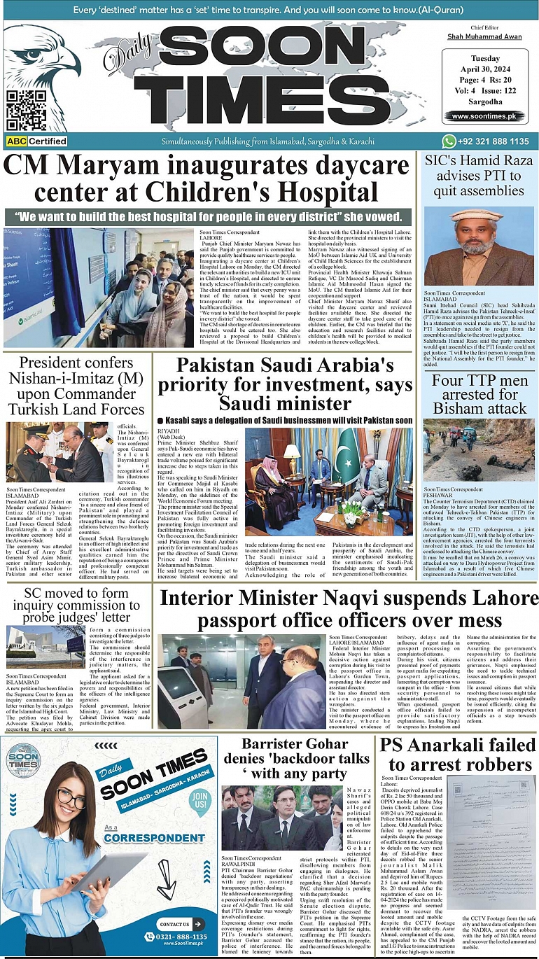 Daily Soon Times April 30, 2024 Daily Soon Times Today’s ePaper Leading English Newspaper from Islamabad, Sargodha, Karachi << First << 1 >> Last >> Page 1Page 2Page 3Page 4 × Daily Soon Times 1234 1234 1
