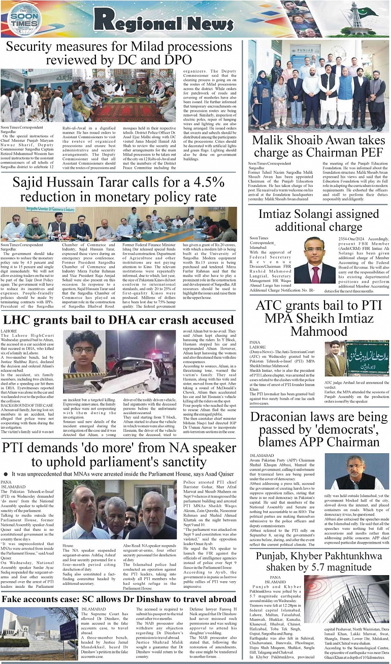 Daily Soon Times Page: 3 September 12, 2024 Daily soon times today's ePaper leading English national newspaper from Islamabad, Sargodha, Karachi, Pakistan << First << 3 >> Last >> Page 1Page 2Page 3Page 4 × Daily Soon Times 1.23.4 1.23.4 3.